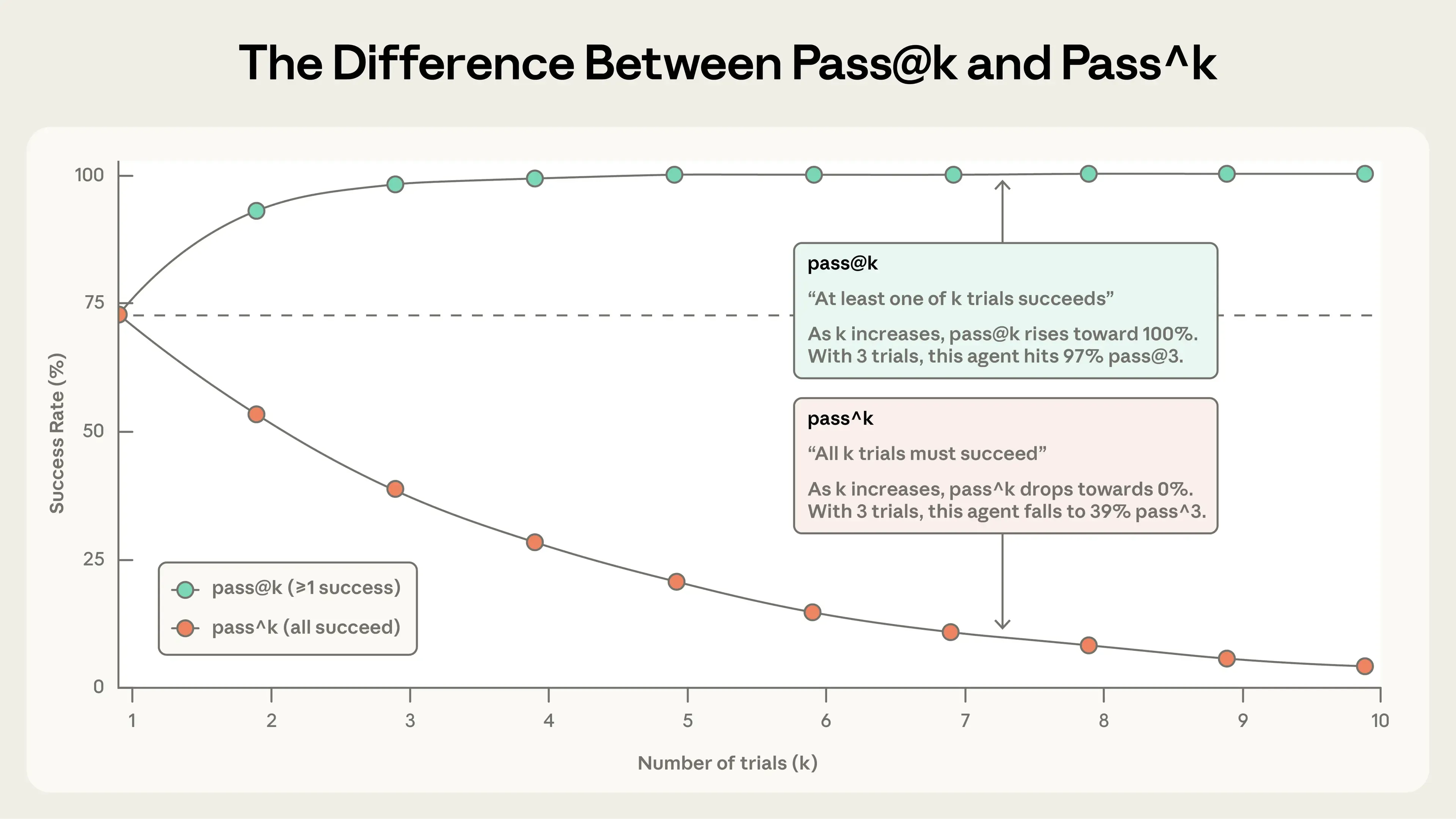 随着试验次数的增加,pass@k 和 pass^k 出现分化。在 k=1 时,它们是相同的(都等于每次试验的成功率)。到 k=10 时,它们呈现出截然相反的情况:pass@k 接近 100%,而 pass^k 降至 0%。
